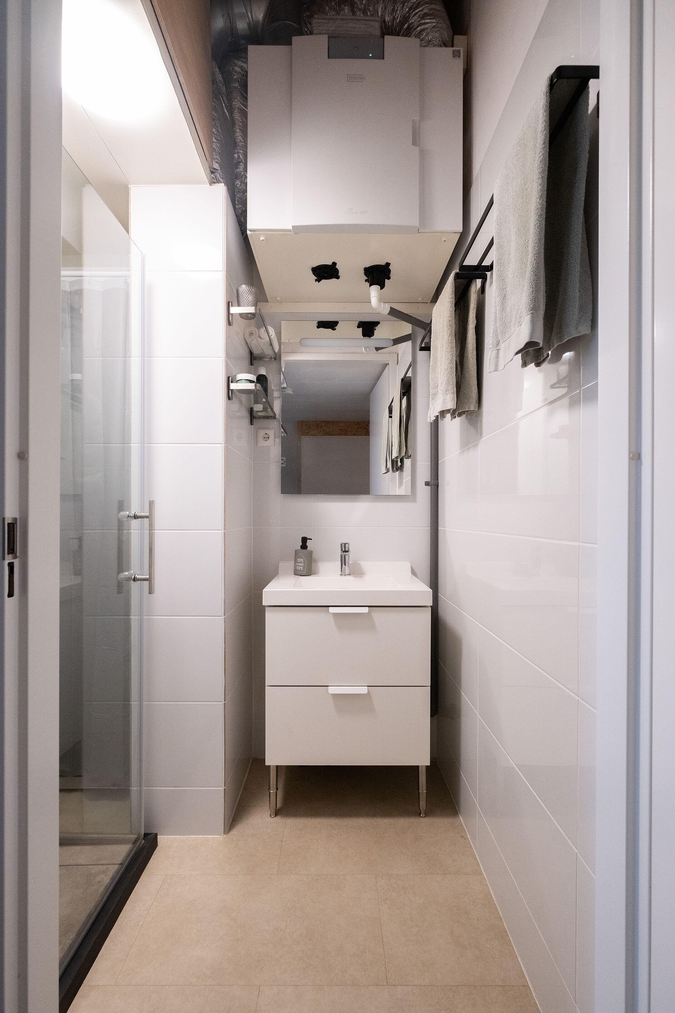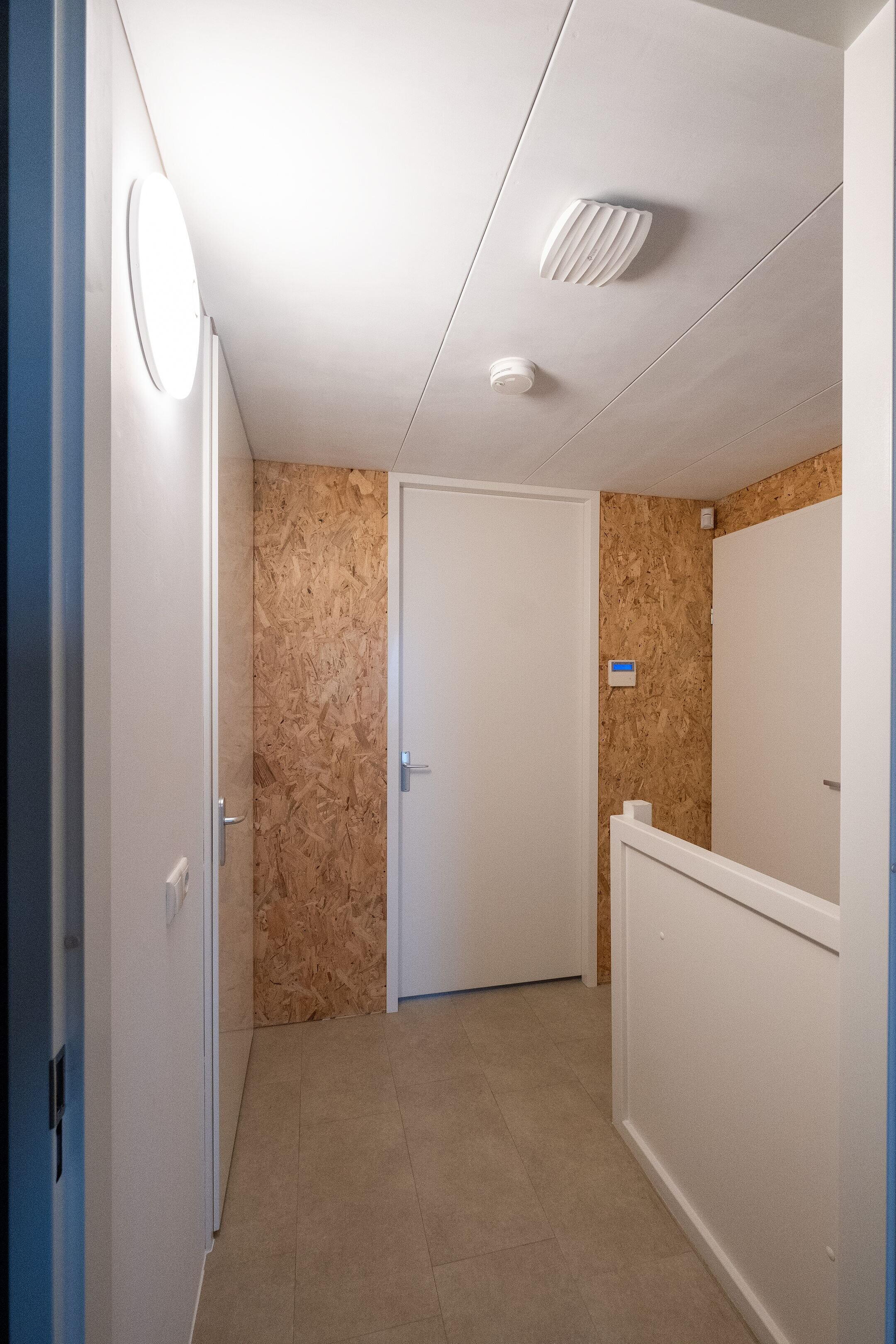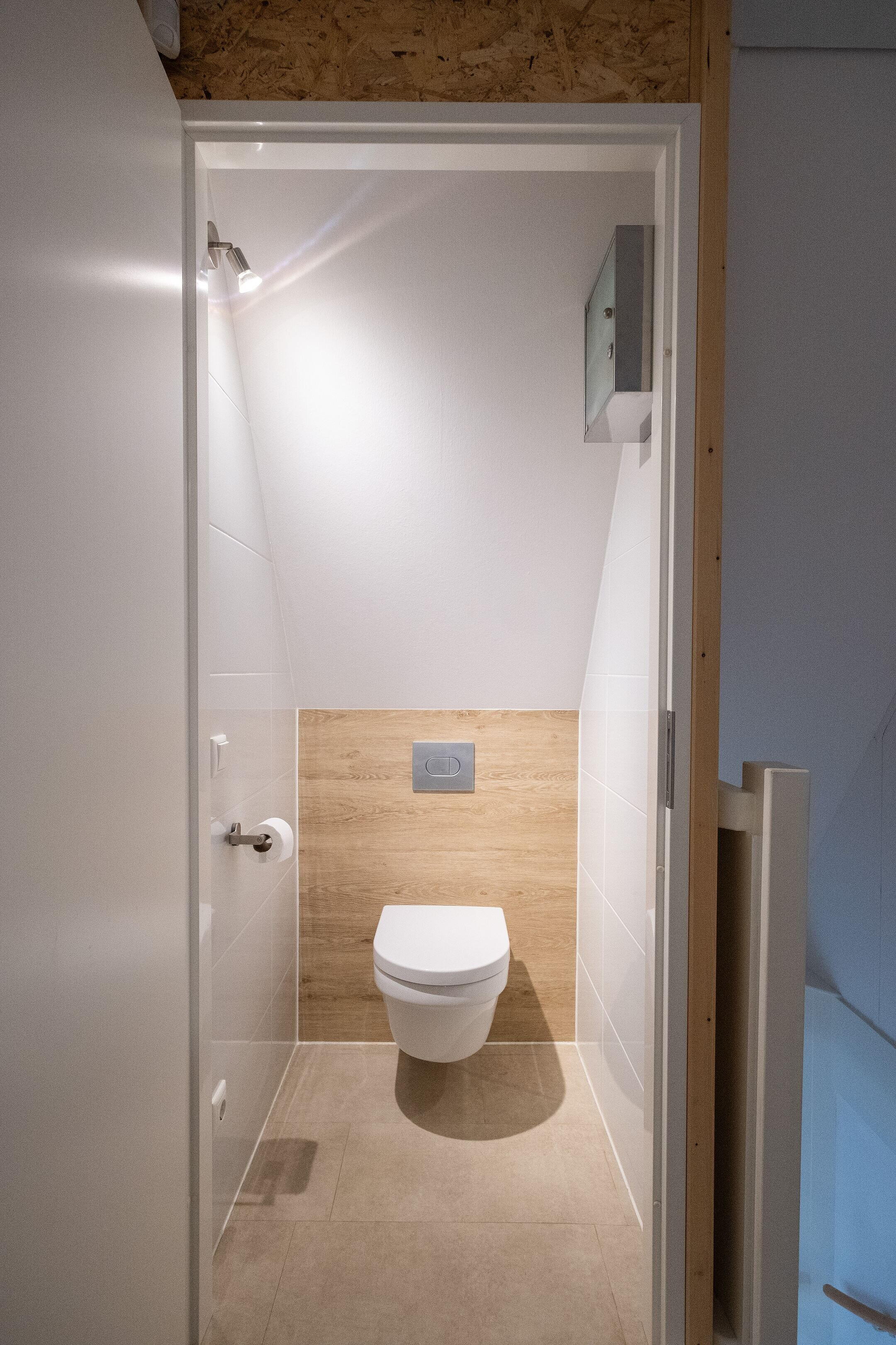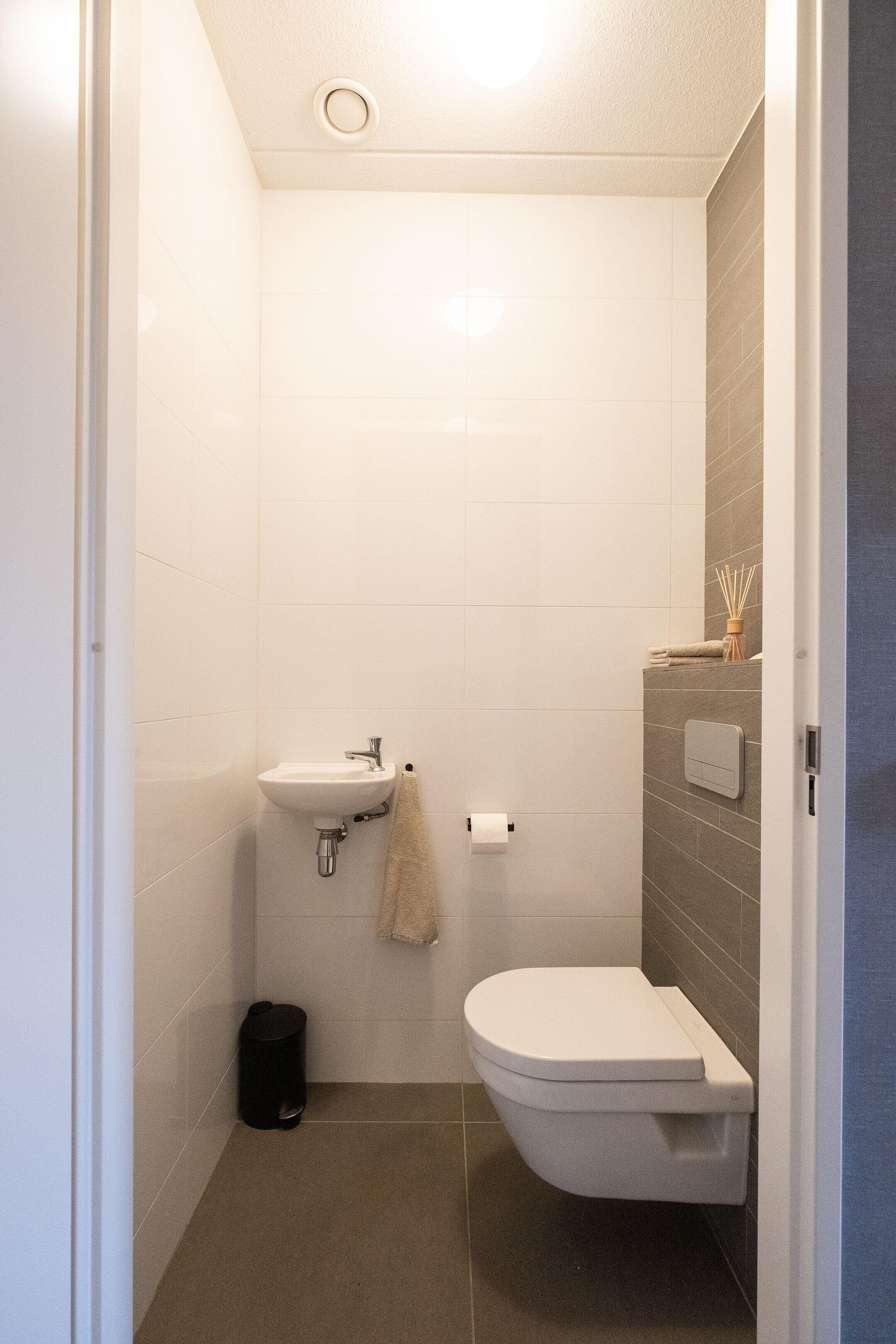 Via de entree kom je binnen in de hal met een hangend toilet en een kast met de warmtepomp en 150 liter boiler.