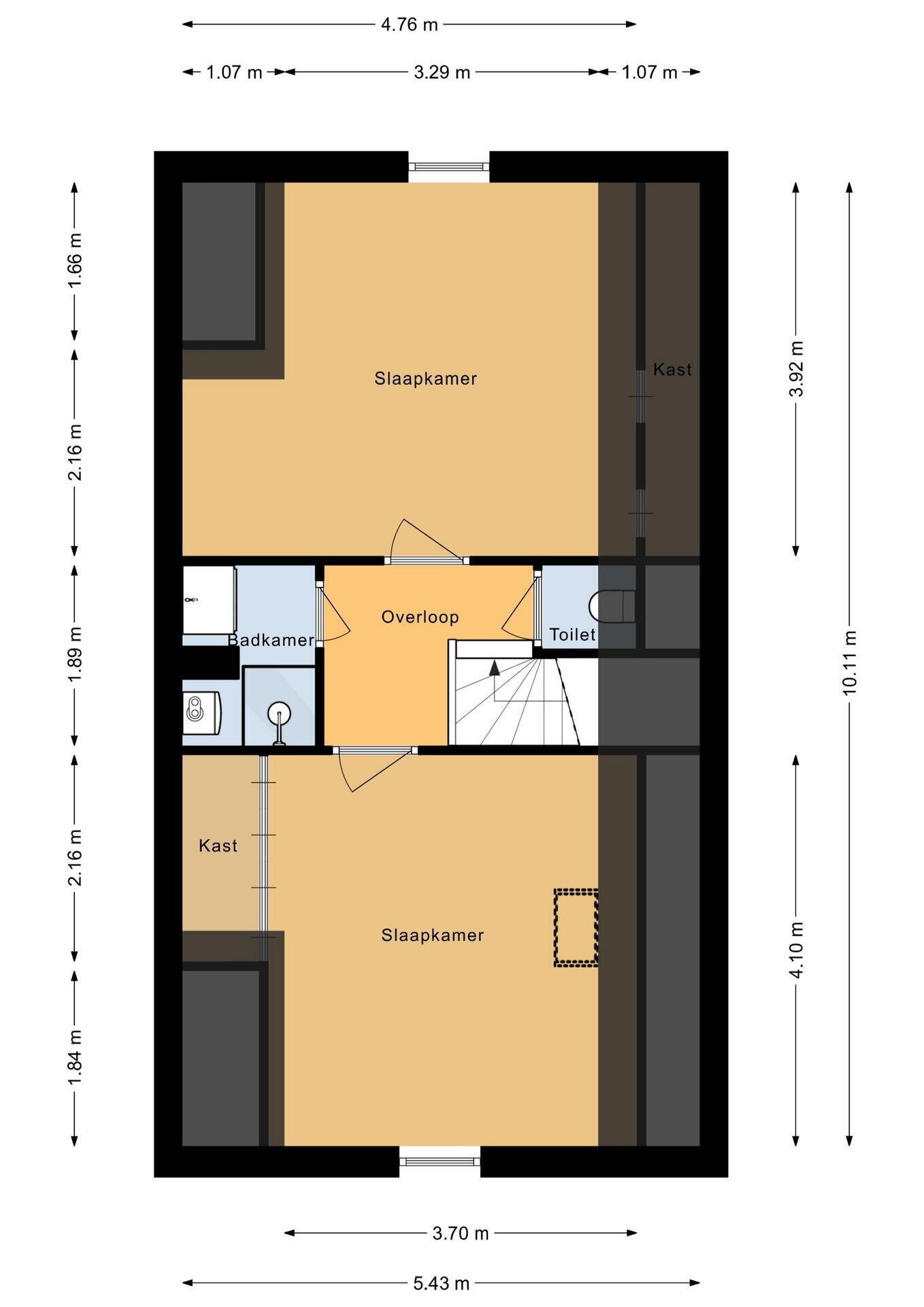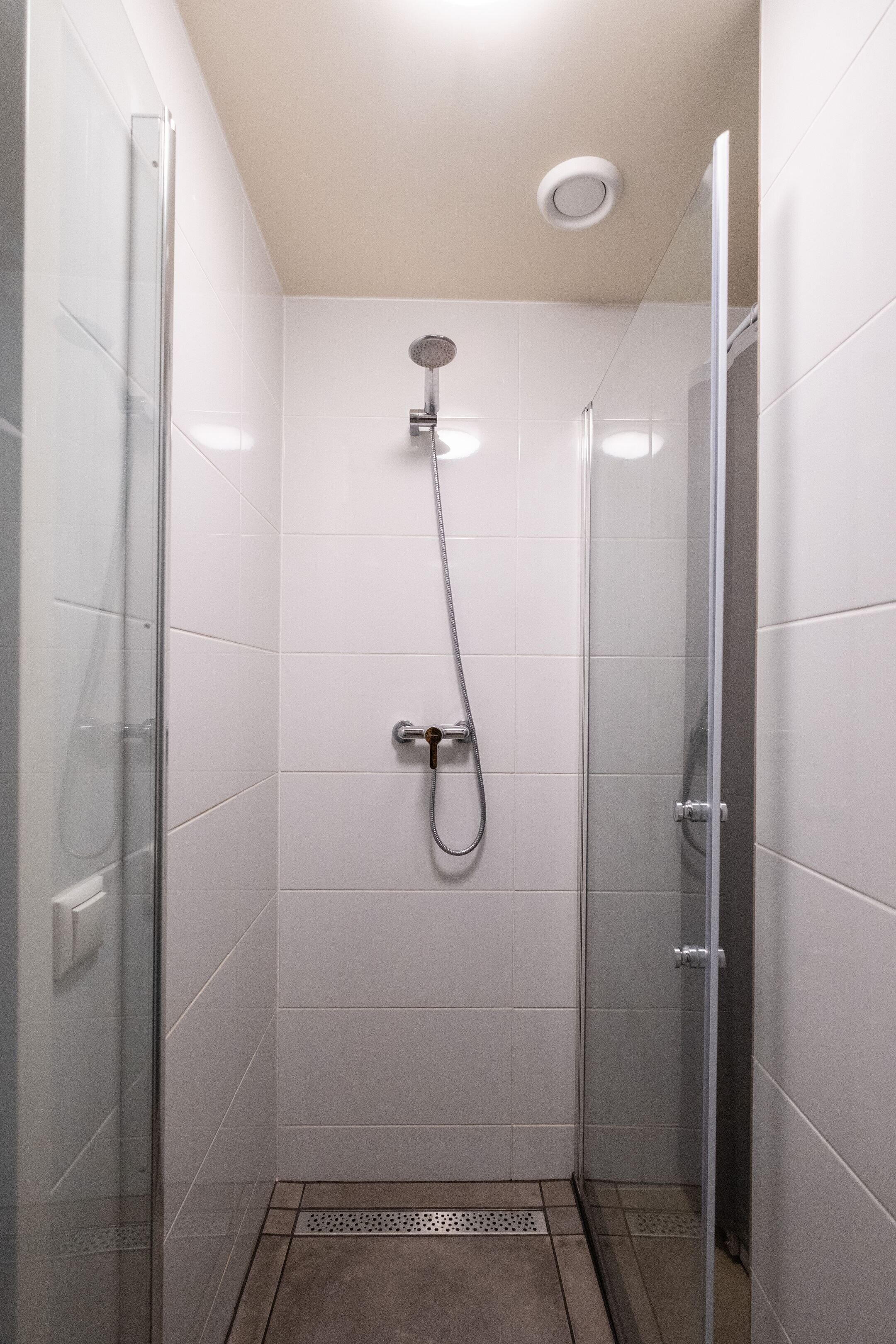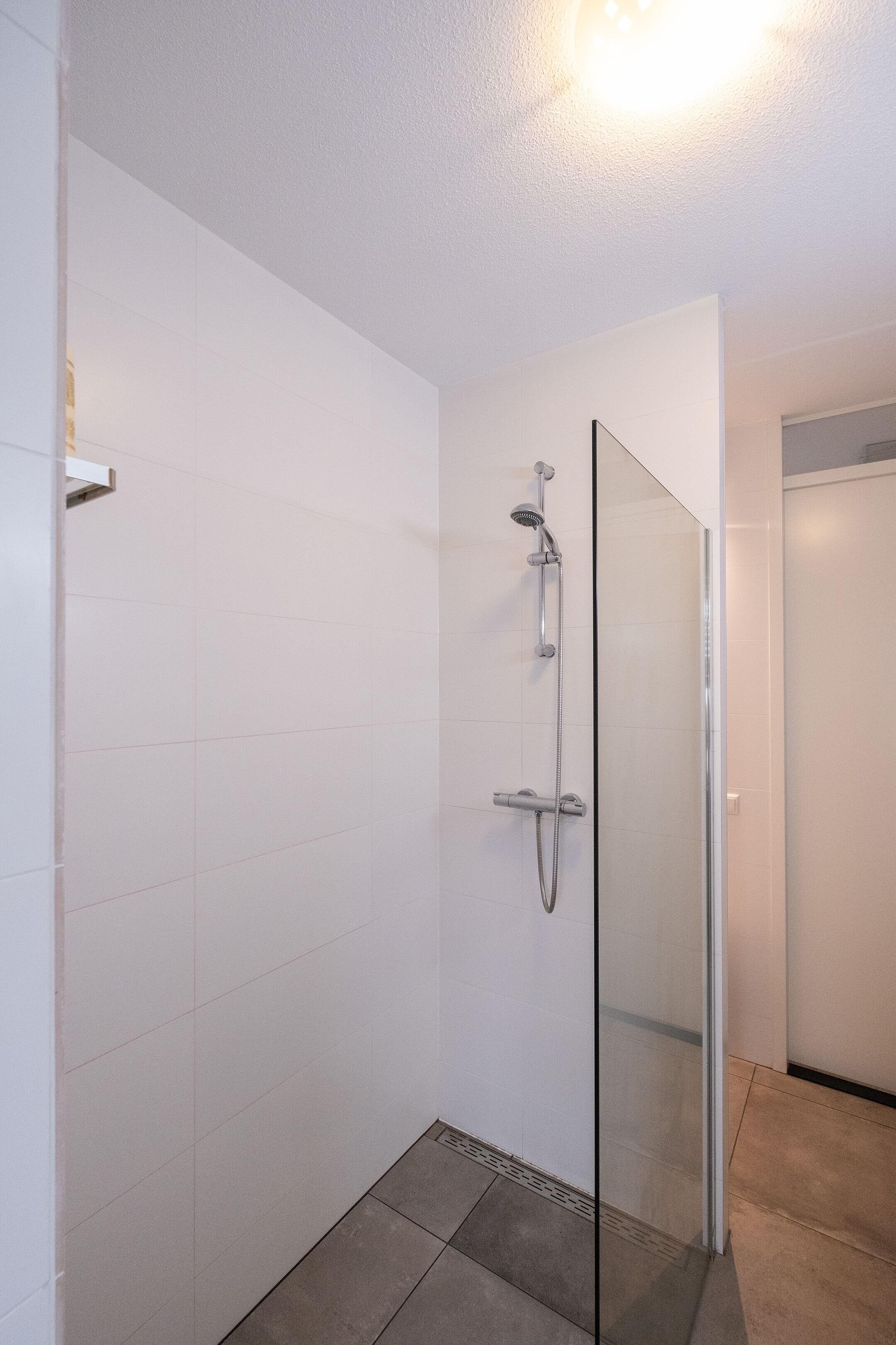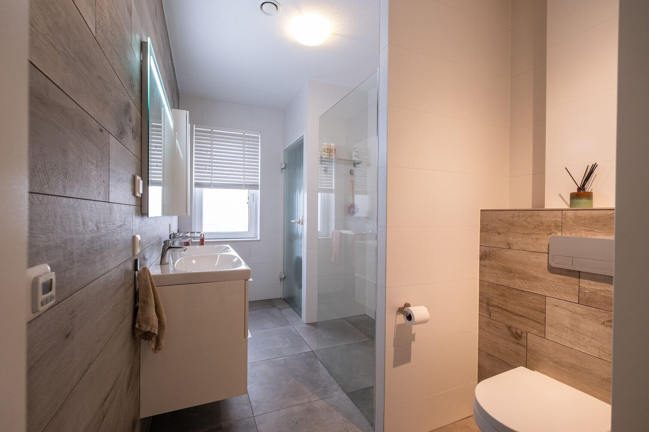 De badkamer op deze verdieping is compleet ingericht met een toilet, inloopdouche, dubbele wastafel, vloerverwarming en een raam met mechanische ventilatie. Daarnaast is hier een kast met aansluitingen voor wasmachine en/of droger.