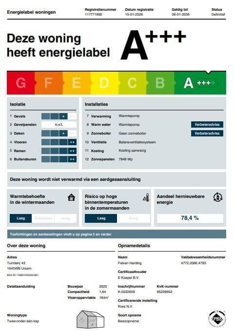 Bouwjaar 2020 betekent een gasloze met AARDWARMTE (verwarming en koeling) en optimaal geïsoleerde woning met KUNSTSTOF KOZIJNEN en een energielabel A+++. De energiekosten van de huidige bewoners ligt heel laag op circa € 35,- per maand!